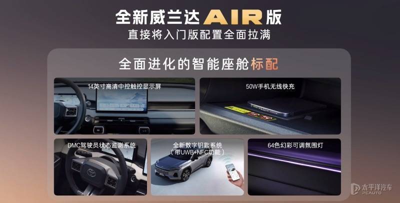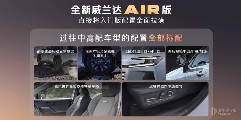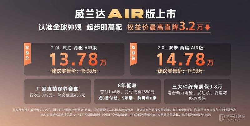 【太平洋汽车 新车频道】2月24日,全新丰田威兰达AIR版正式上市,新车共推出2款车型,官方指导价区间为16.98-17.98万元,权益价为13.78-14.78万元,并提供8年低息购车方案,首付1.46万元,月供低至1650元。作为新增车型,新车动力提供2.0L发动机和2.0L混动系统可选,并标配LSD限滑差速器、丰田TSS 4.0智能辅助系统等豪华配置。
