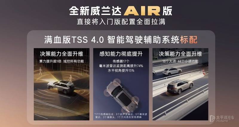 配置方面,新车标配了丰田TSS 4.0智能辅助系统、9个安全气囊、自适应远近LED大灯、电动天窗、50W手机无线充电、主驾驶座椅电动调节、后排空调出风口等配置。相较于PRO版车型,主要少了360度全景影像、前排无钥匙进入、可开启全景天窗、雨量感应式雨刷、高通骁龙8155芯片、26.4英寸HUD抬头显示、副驾驶座椅电动调节等配置,指导价少了1.2万元。